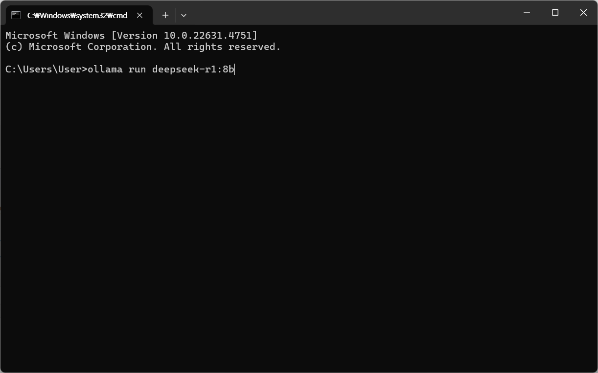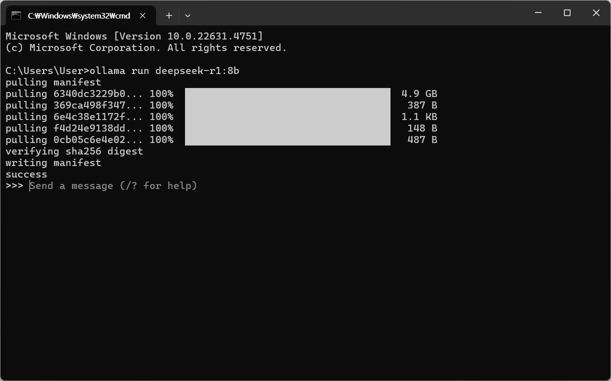 명령 프롬프트에 아까 복사한 'ollama run deepseek-r1:xb'을 입력하고 엔터를 누릅니다.