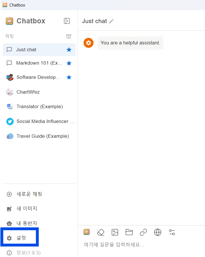 설치된 ChatBox를 실행하고 왼쪽 사이드바 하단에 있는 설정을 누릅니다.
