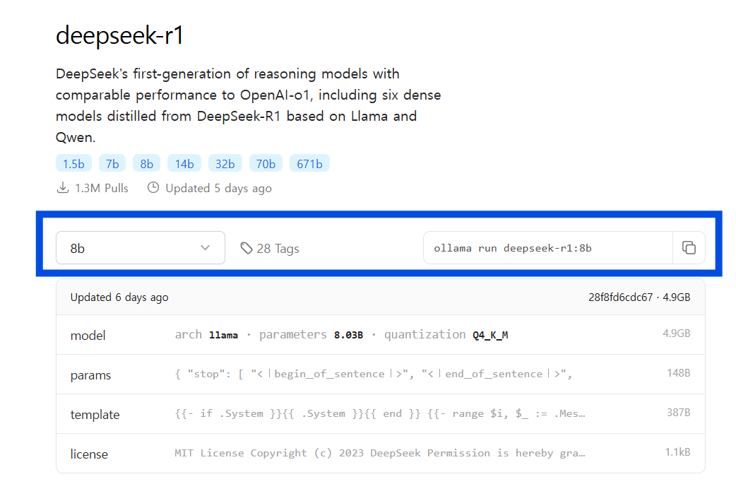 아래 ollama 링크로 들어가서 deepseek r1 모델 중 하나를 선택합니다. 용량이 큰 모델일수록 성능이 더 좋지만 더 높은 컴퓨터 사양이 필요합니다.