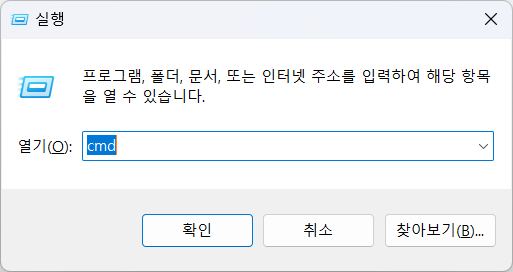 윈도우 + R을 눌러 실행 창을 열고 cmd를 입력하여 명령프롬프트를 엽니다.