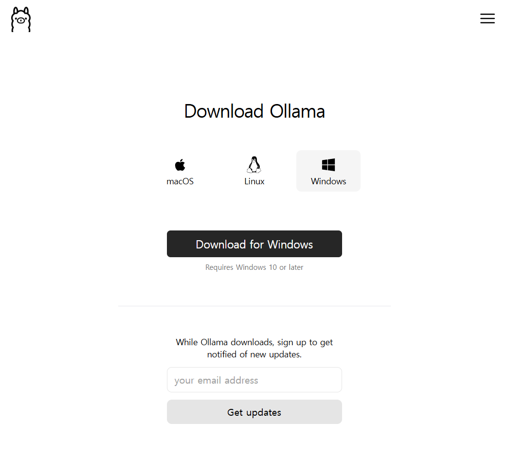 공식 홈페이지에서 자신 OS에 맞는 ollama를 다운 받아 설치합니다.
