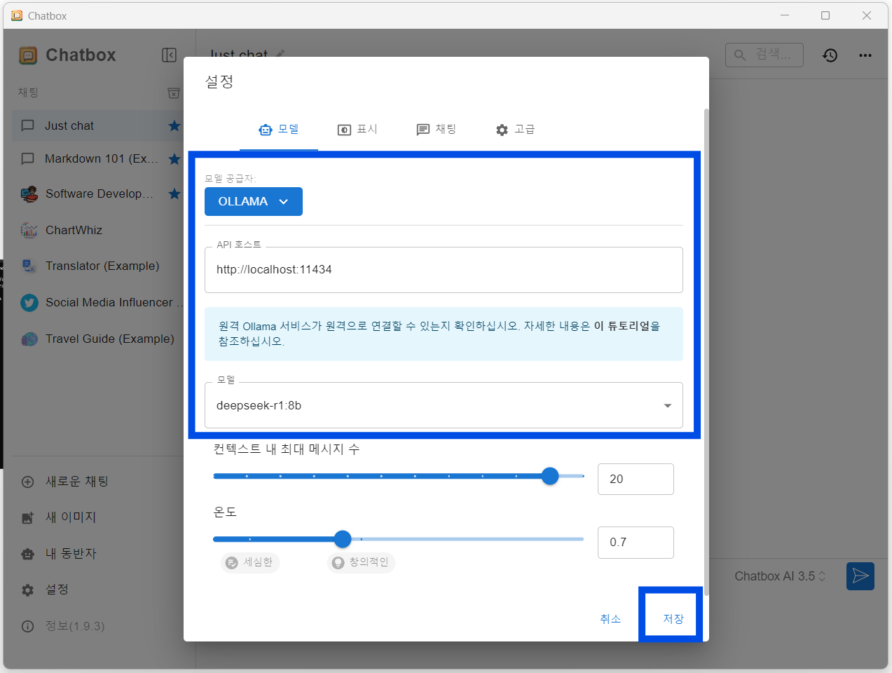 설정에서 모델 공급자는 OLLAMA로 지정하고 API 호스트는 http://127.0.0.1:11434 또는 http://localhost:11434로 지정합니다. 모델은 설치한 deepseek 모델을 선택합니다. 설정을 완료하면 저장을 누릅니다.