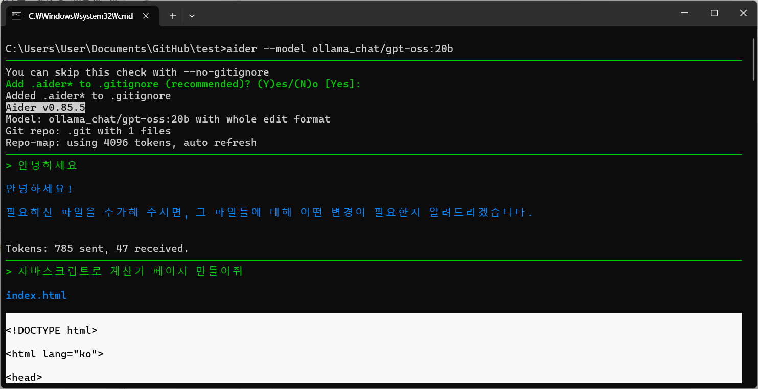 요즘 AI를 이용한 바이브 코딩을 유행하고 있습니다. 저도 gemini-cli를 이용해 이런 방식으로 코딩을 해봤는데요.다만 비용 문제나 프라이버시·보안상의 이유로, 온라인 AI 서비스에 코드를 입력하는 것이 꺼려질 수 있습니다.그래서 gemini-cli나 claude-code와 비슷한 환경을 로컬에서 구현할 방법을 찾아봤습니다. 최근 공개된 OpenAI의 오픈소스 모델 gpt-oss를 로컬 AI 코딩 어시스턴트로 사용해보기로 했습니다.처음에는 VS Code + Cline 조합을 시도했는데 gpt-oss로는 제대로 작동하지 않았습니다.이후 몇 가지 방법을 더 시도해본 결과, 제 PC에서 제대로 작동한 건 Ollama + Aider 조합이었습니다. 아래에 설치 방법과 실행 결과를 정리했습니다. 1. Ol..